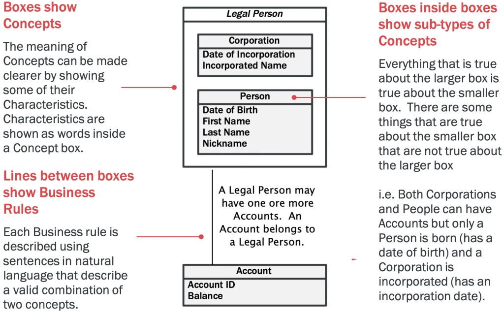 The Information Model’s contents are presented in a series of business diagrams that only use boxes, lines and words. These diagrams enable business SMEs to challenge the model to determine whether: